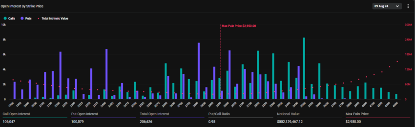 Ethereum’un 206.626 sözleşme içeren 552,13 milyon dolarlık opsiyonun vadesi de bugün doluyor. Bu rakam, bir önceki haftanın 183.756 sözleşmesine göre bir artışa işaret ediyor. Bu opsiyonlar için maksimum acı noktası 2.950 dolar ve put/call oranı 0,95. Kripto para opsiyonları piyasasındaki maksimum acı noktası, opsiyon sahiplerine en fazla finansal rahatsızlık veren fiyat seviyesini temsil eder. Bu arada, put/call oranı, satın alma opsiyonlarının (call) satış opsiyonlarına (put) göre daha yaygın olduğunu gösteriyor.