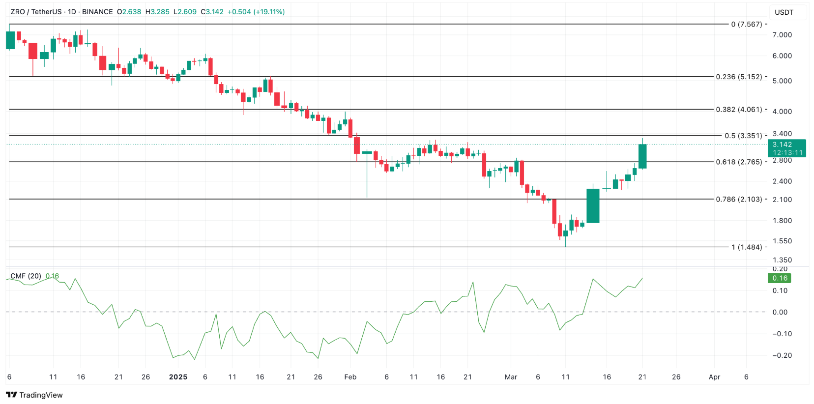 ZRO fiyatı, piyasanın aksine %23 artarak 3,14 dolara çıktı. Bu dikkat çekici artış, yatırımcıların ilgisini artırdı. CMF göstergesi 0,16 seviyesinde ve yükseliş eğiliminde. Bu da paranın token’a aktığını gösteriyor. Satış baskısı düşük, alım iştahı yüksek.