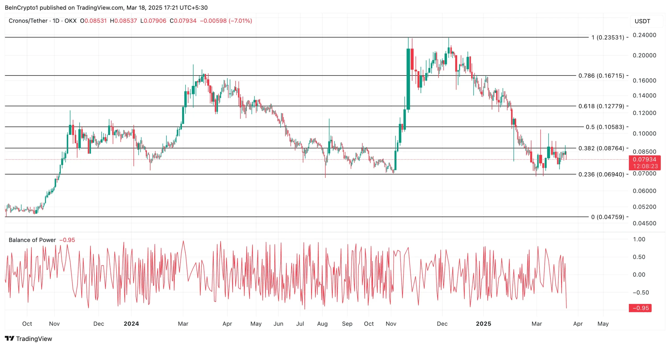 CRO’nun negatif BoP’si, satış baskısının satın alma baskısından daha güçlü olduğunu ve piyasada düşüş eğiliminin hakim olduğunu gösteriyor. Bu, coin satıcılarının fiyat hareketini kontrol ettiği ve potansiyel olarak daha fazla düşüşe yol açtığı anlamına geliyor. Düşüş eğilimi devam ederse, CRO’nun fiyatı 0,06 dolara kadar düşebilir.