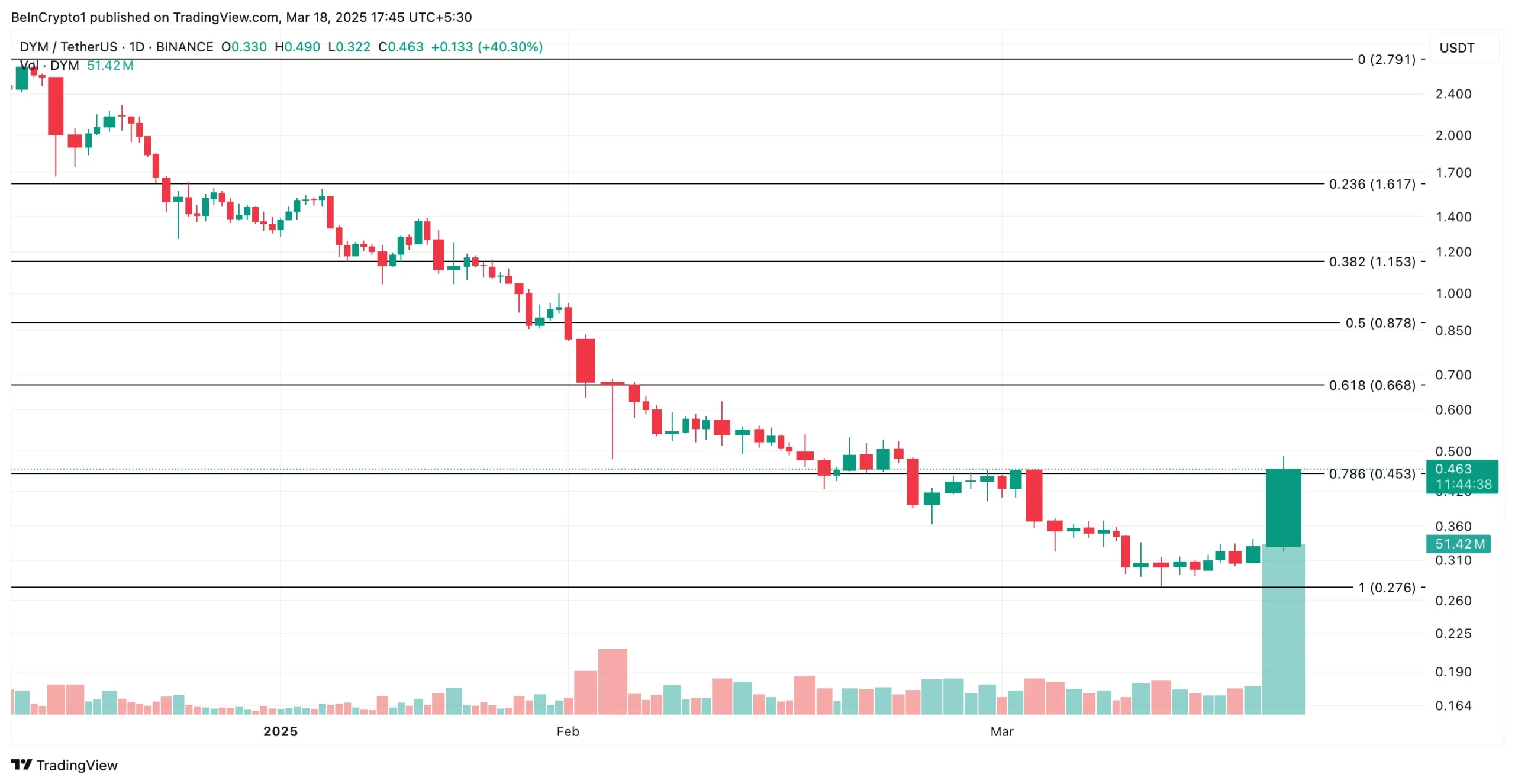 DYM son 24 saatte %40 artış gösterdi. Aynı dönemde işlem hacmi %338 artarak 162 milyon dolara ulaştı. Bir varlığın fiyatı ve işlem hacmi aynı anda yükseldiğinde, bu güçlü bir alım baskısı ve piyasa ilgisi olduğunu gösterir. DYM’nin yüksek işlem hacmi, fiyat artışının önemli bir katılımla desteklendiğini doğrulayarak yanlış bir kırılma olasılığını azaltıyor. Bu eğilim bir boğa sinyalidir ve talebin güçlü kalması halinde ivmenin devam edeceğini gösterir. Bu durumda, altcoin’in fiyatı 0,66 dolara kadar tırmanabilir.