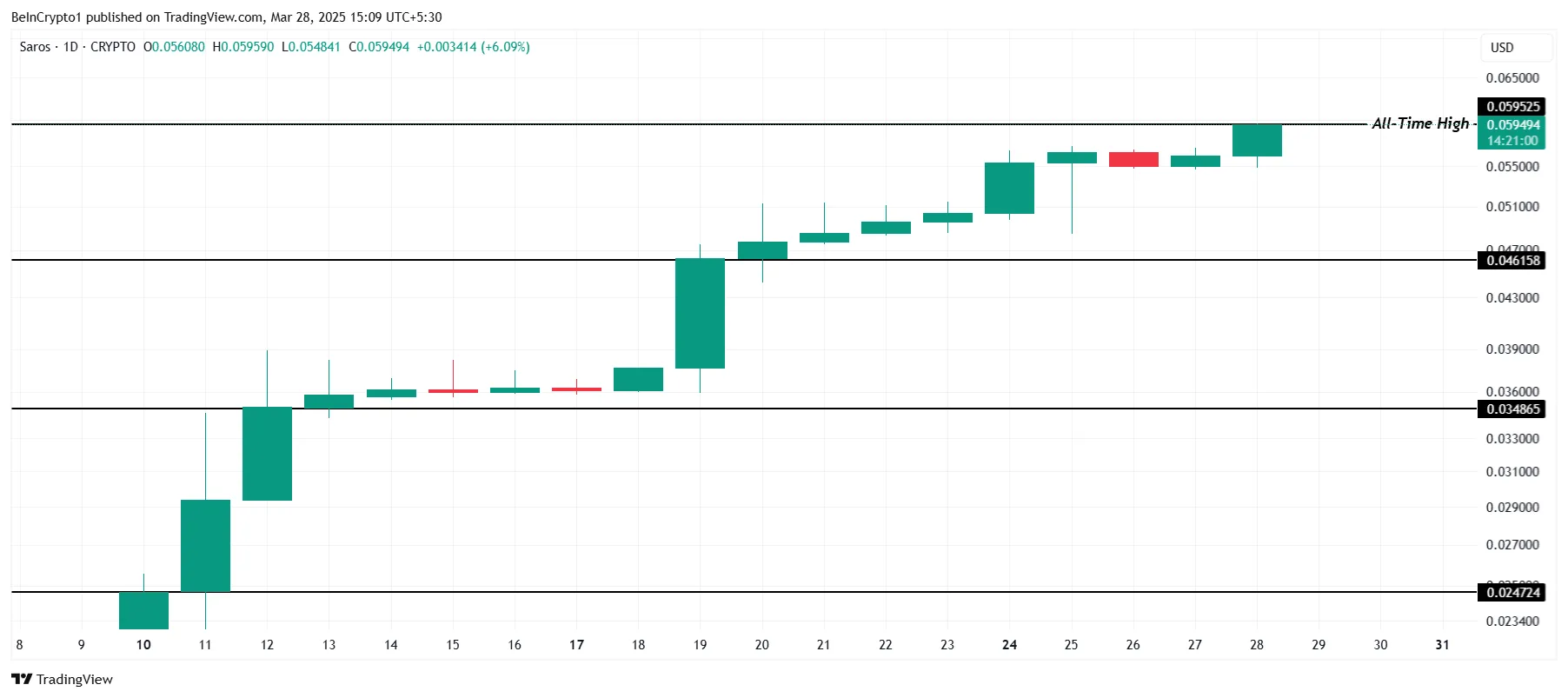 SAROS bugün 0,0595 dolarla tüm zamanların en yüksek seviyesini görerek yukarı yönlü ivmesini sürdürdü. Bu yükseliş, sağlam bir destek olan 0,0461 doları başarılı bir şekilde korumasının ardından geldi. Altcoin fiyatının istikrarlı yükselişi, artan yatırımcı ilgisini yansıtıyor. Daha geniş piyasa koşullarının yükselişe devam etmesiyle SAROS’un yukarı yönlü seyrini sürdürmesi muhtemel. Kripto para 0,0600 dolar seviyesini aşmaktan sadece birkaç santim uzakta. Bu bariyer aşıldığında kolayca 0,0650 dolar ve ötesine tırmanabilir.