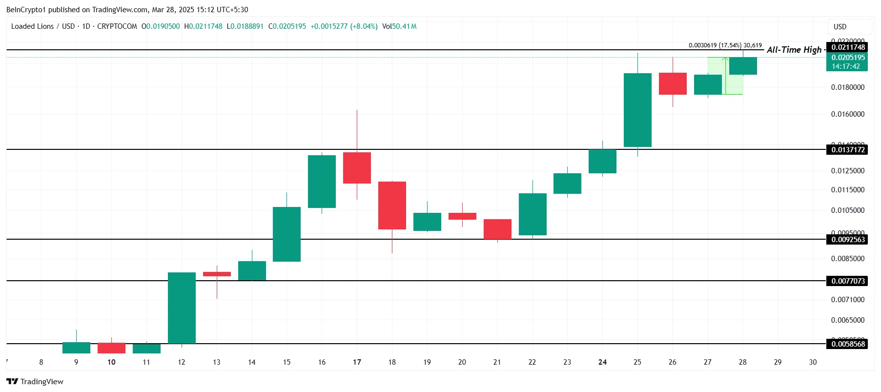 LION’un fiyatı son 24 saatte %17,5 artarak tüm zamanların en yüksek seviyesi olan 0,0211 dolara ulaştı. Bu fiyat artışı, artan yatırımcı güvenine ve güçlü ivmeye işaret ediyor. Böylece, daha fazla dikkat çektikçe LION’u kısa vadede daha fazla yükseliş için konumlandırıyor. Bu arada, bu hafta LION ikinci ATH’ının kaydetmiş oldu. Dolayısıyla bu, altcoin’in yükseliş trendinin devam edeceğini gösteriyor. Fiyatı destekleyen yükseliş momentumuyla LION yakında 0,0250 dolar ya da daha yüksek bir seviyeye ulaşabilir.