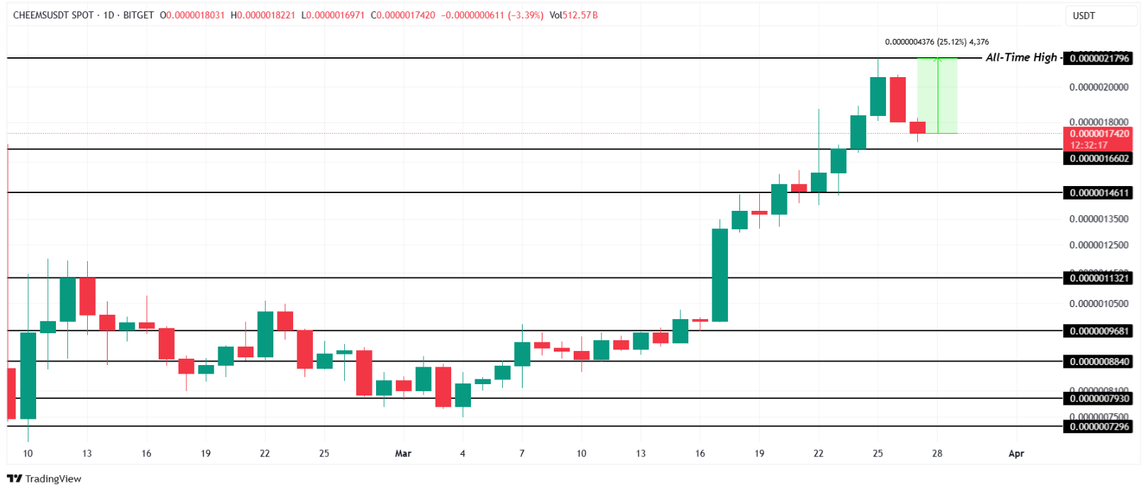 CHEEMS, bu ay dikkat çekici bir şekilde yeni ATH’sini 0.000002179 dolarda oluşturdu. Şu anda bu seviyeye %25 mesafede olan token, yatırımcı ilgisini çekmeye devam ediyor. Fiyatın 0.000001660 dolar desteğinden güç alarak sıçrama yapması bekleniyor.