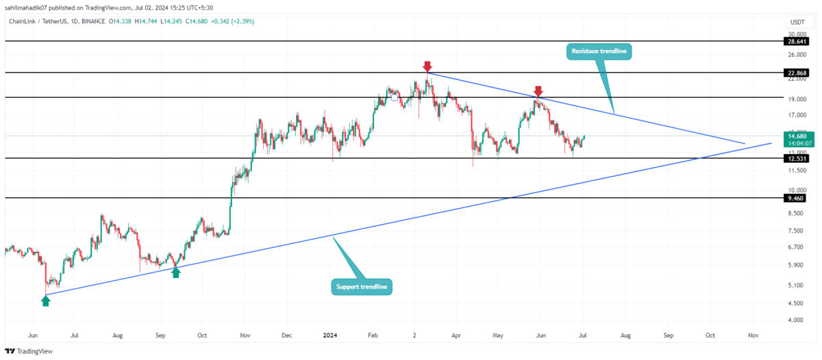 Chainlink’in orta vadeli trendi, yükselen bir trend çizgisiyle destekleniyor. Ancak, coin geniş piyasa konsolidasyonu sırasında bir düzeltme aşamasına girdi. Bu durum, alıcıların yeni zirvelere ulaşmak için gerekli ivmeye şu anda sahip olmadığını gösteriyor.