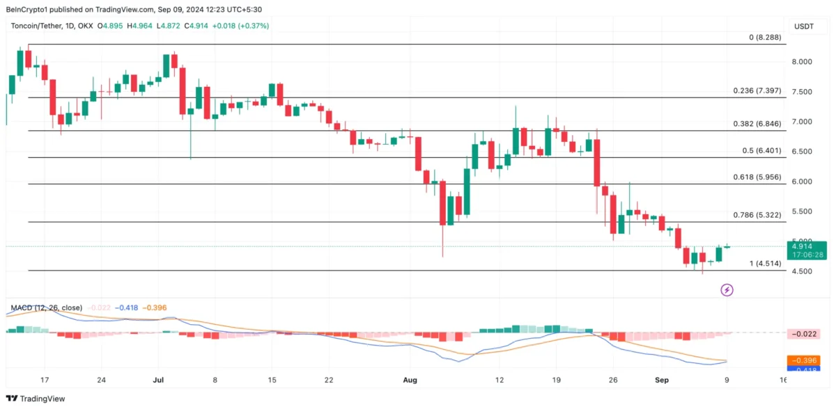 Toncoin Günlük Analizi. Kaynak: TradingViewAncak, kâr alımları yoğunlaşırsa bu yükseliş tahminleri muhtemelen geçersiz olur. Artan satış baskısının altcoin fiyatını 4,51 dolara kadar düşürmesi olası.