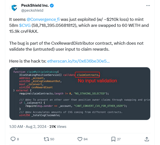 Merkezi olmayan finans protokolü Convergence, 1 Ağustos’ta bir akıllı sözleşme istismarı yoluyla saldırıya uğradı. Protokol, bir bilgisayar korsanının, Convergence’in kendi yerel tokeninde 210 bin dolar basarak sattığını ve talep edilmemiş stake ödüllerinden 2.000 dolar çaldığını doğruladı. Convergence protokolünün takma isimli kurucusu Wireshark’ın yeni yayınladığı bir otopsi raporuna göre, bilgisayar korsanı protokolün CvxRewardDistributor sözleşmesini istismar ederek 58 milyon CVG tokenını yaklaşık 210.000 dolar karşılığında bastı ve sattı.
