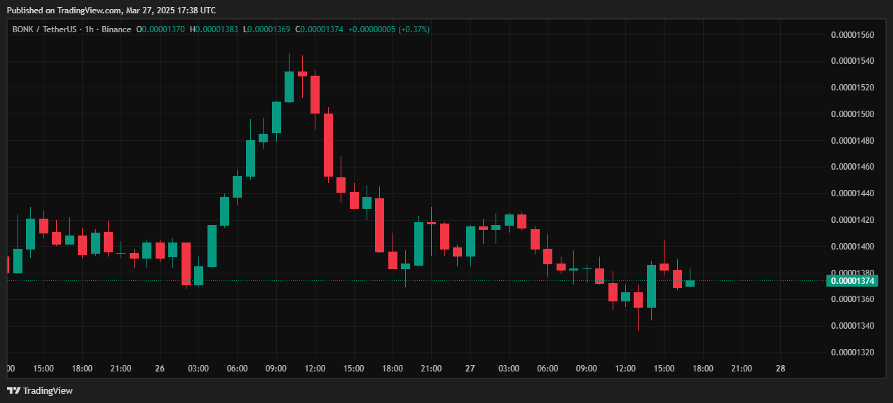 Exchange Art’ın satın alınmasıyla birlikte BONK fiyatlarının yükselmesi beklense de şu an için büyük bir hareketlenme görülmüyor. Satın alma duyurusunun ardından BONK’un fiyatı son 24 saatte %6 düşerek 0.00001361 seviyesine geriledi. Günlük işlem hacmi de %30 azalarak 107 milyon dolara kadar düştü.