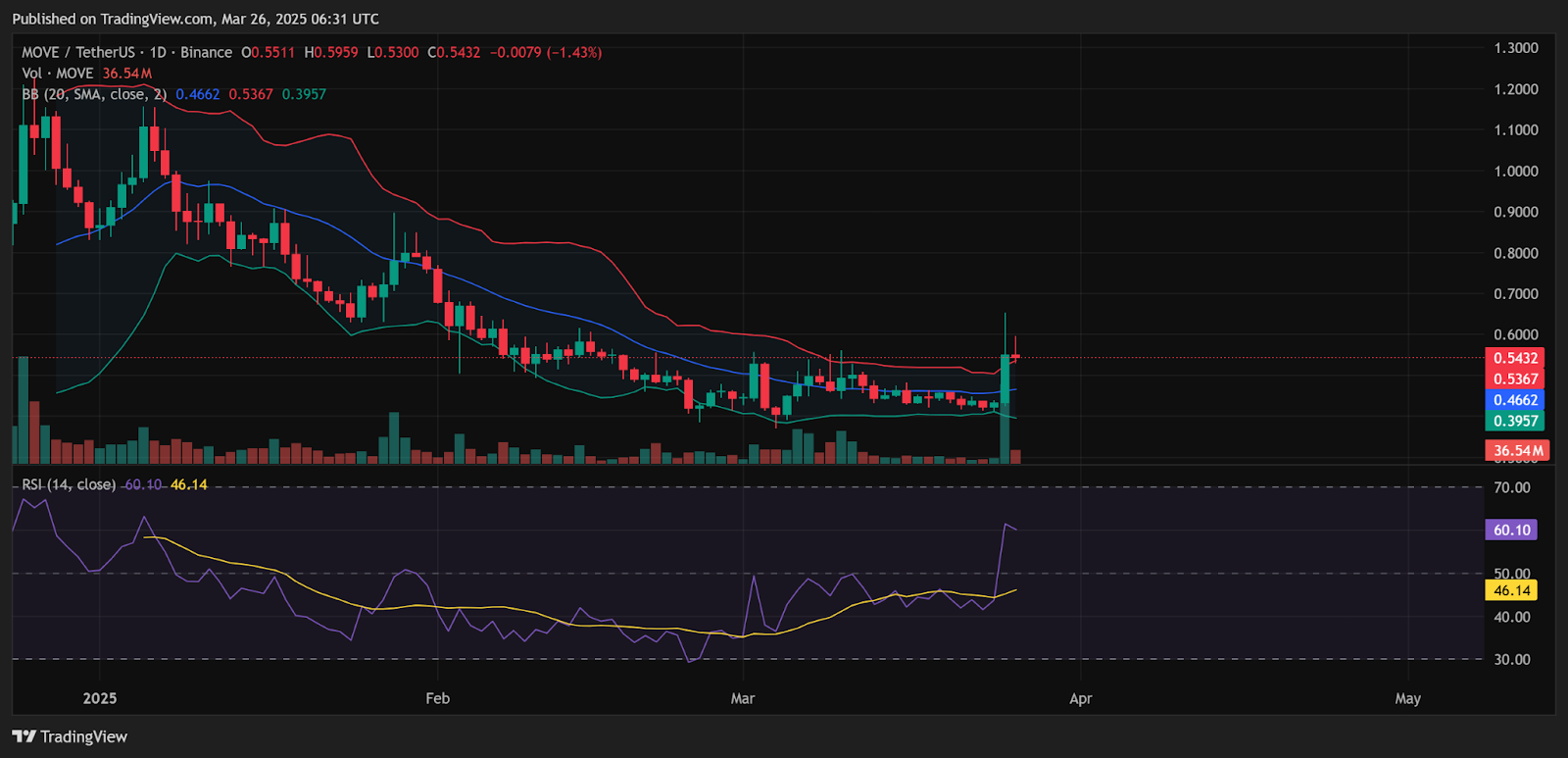 Grafik analizine göre, MOVE’un fiyat hareketi yalnızca 20 günlük Basit Hareketli Ortalamayı (SMA) geçmekle kalmadı, aynı zamanda 0,5367 dolar civarında bulunan üst Bollinger Bandına da dokundu. Bollinger Bantlarının genişlemesi tipik olarak fiyat oynaklığının arttığını gösterir ve yükselişin devam etme olasılığını ortaya koyar. Fiyat 0,53 dolar seviyesinin üzerinde konsolide olmayı başarırsa, MOVE bir sonraki direnç seviyesini 0,60 dolar civarında test etmeyi ve daha yükseğe çıkmayı hedefleyebilir.