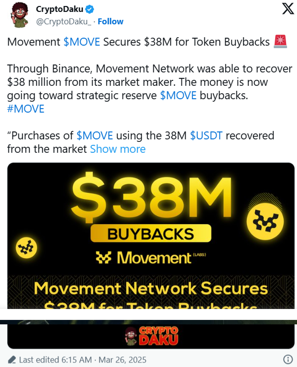 Kriptokoin.com’dan takip ettiğiniz üzere, Binance’in müdahalesinin ardından, sorunlu piyasa yapıcı 18 Mart’ta platformdan çıkarıldı. Geri kazanılan fonlar şimdi Movement Labs tarafından, geri alım programlarının bir parçası olarak önümüzdeki üç ay boyunca Binance üzerinden MOVE token satın almak için kullanılacak.