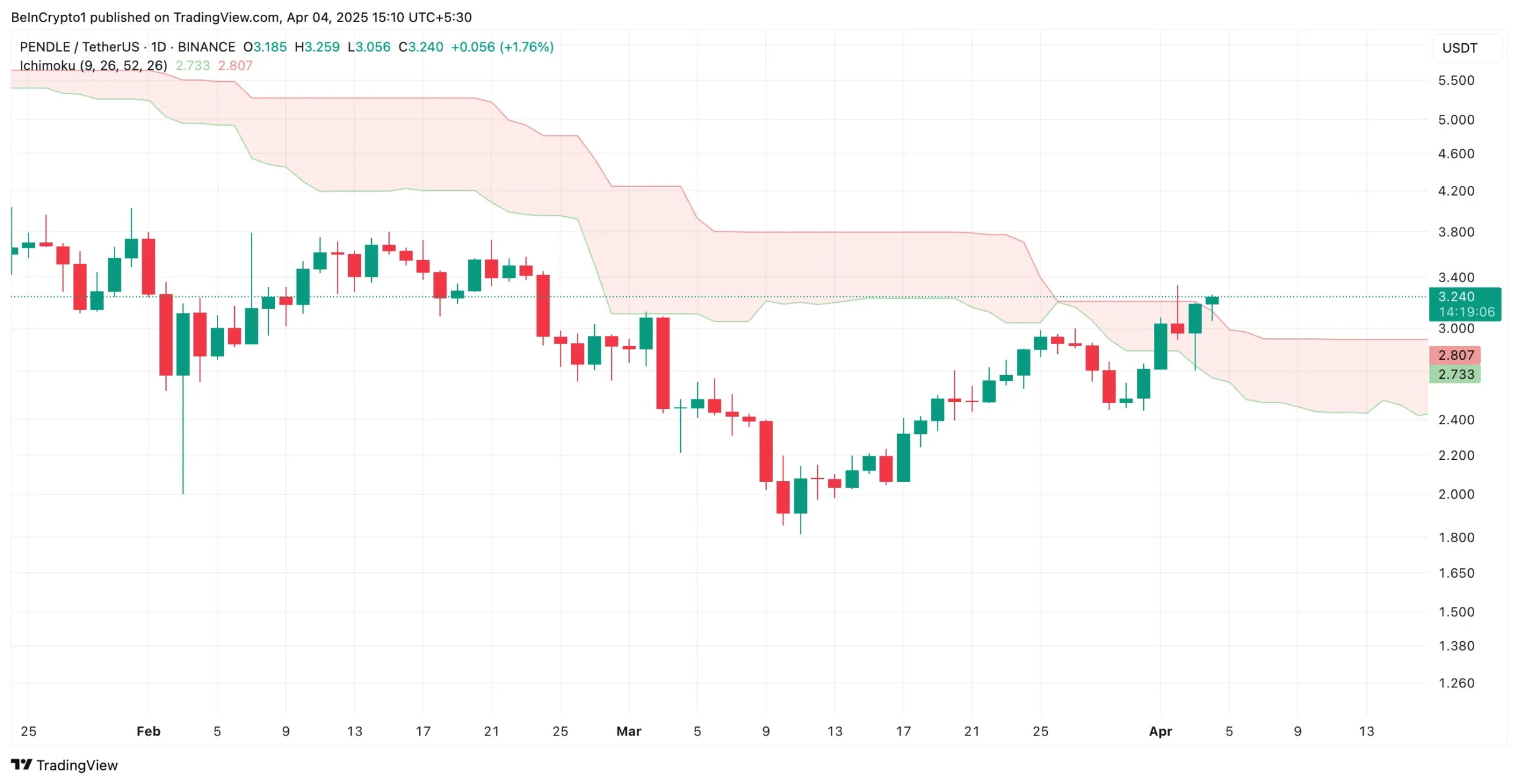 Altcoinin fiyatındaki bu çift haneli artış, PENDLE’nin Ichimoku Bulutu göstergesinin Lider Span A ve B seviyelerinin üzerine çıkmasına neden oldu. Bu seviyeler, sırasıyla 2.73 ve 2.80’de yer alan dinamik destek noktaları olarak görev görüyor.