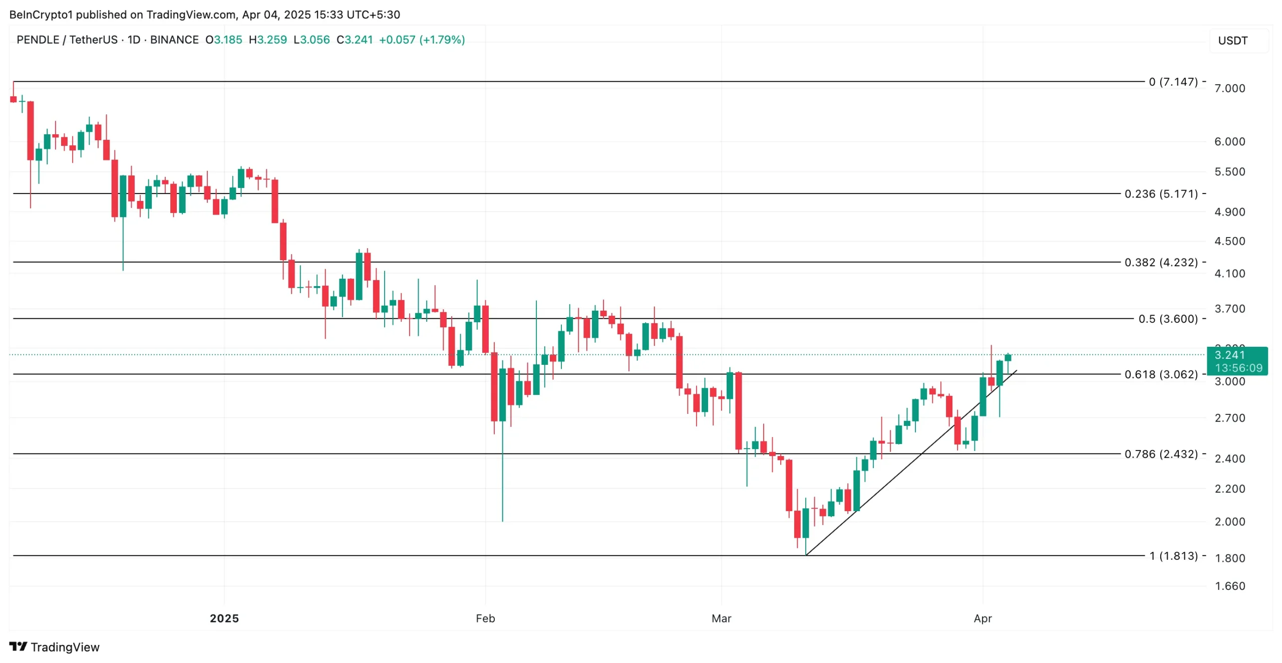 PENDLE, 11 Mart’ta yedi ayın en düşük seviyesi olan 1.81’e kadar geriledi. Ancak, satış baskısının azalmasıyla birlikte alıcılar yeniden hakimiyeti ele aldı ve güçlü bir yükseliş trendi başlattı. Şu anda 3.24 seviyesinden işlem gören PENDLE, o tarihten bu yana yüzde 43’lük bir artış kaydetti.