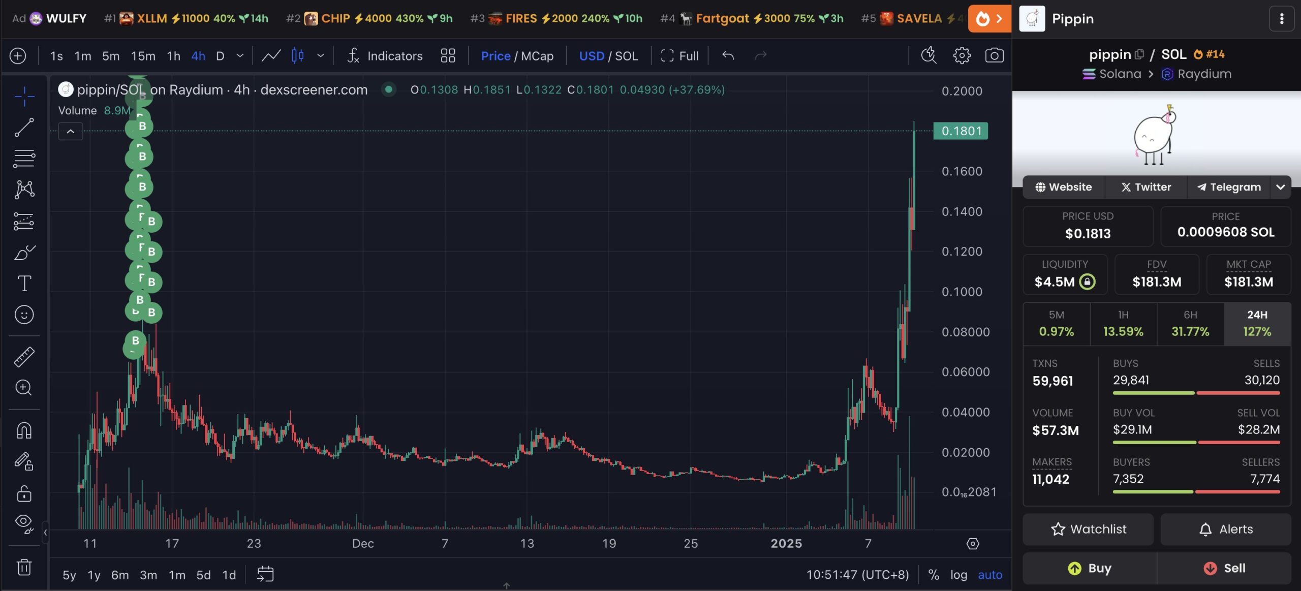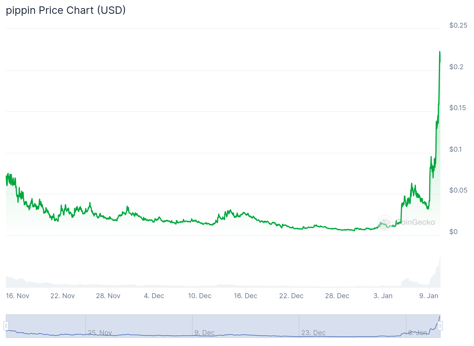 Pippin, son zamanlarda kripto ticaret piyasasında dikkat çeken bir yapay zeka ajanı. Token sadece birkaç ay önce piyasaya adım attı. Kayıplar yaşamasına rağmen, AI kriptoları etrafındaki artan heyecanla son birkaç günde talebi katlanarak arttı. Sonuç olarak, işlem hacmi %150’den fazla artarak bugün 116.980.268 dolara ulaştı. Altcoin fiyatı da %130 artışla 0,091 dolardan 0,21 dolara yükseldi. Böylece token, 210 milyon dolarlık bir piyasa değeri elde etti.