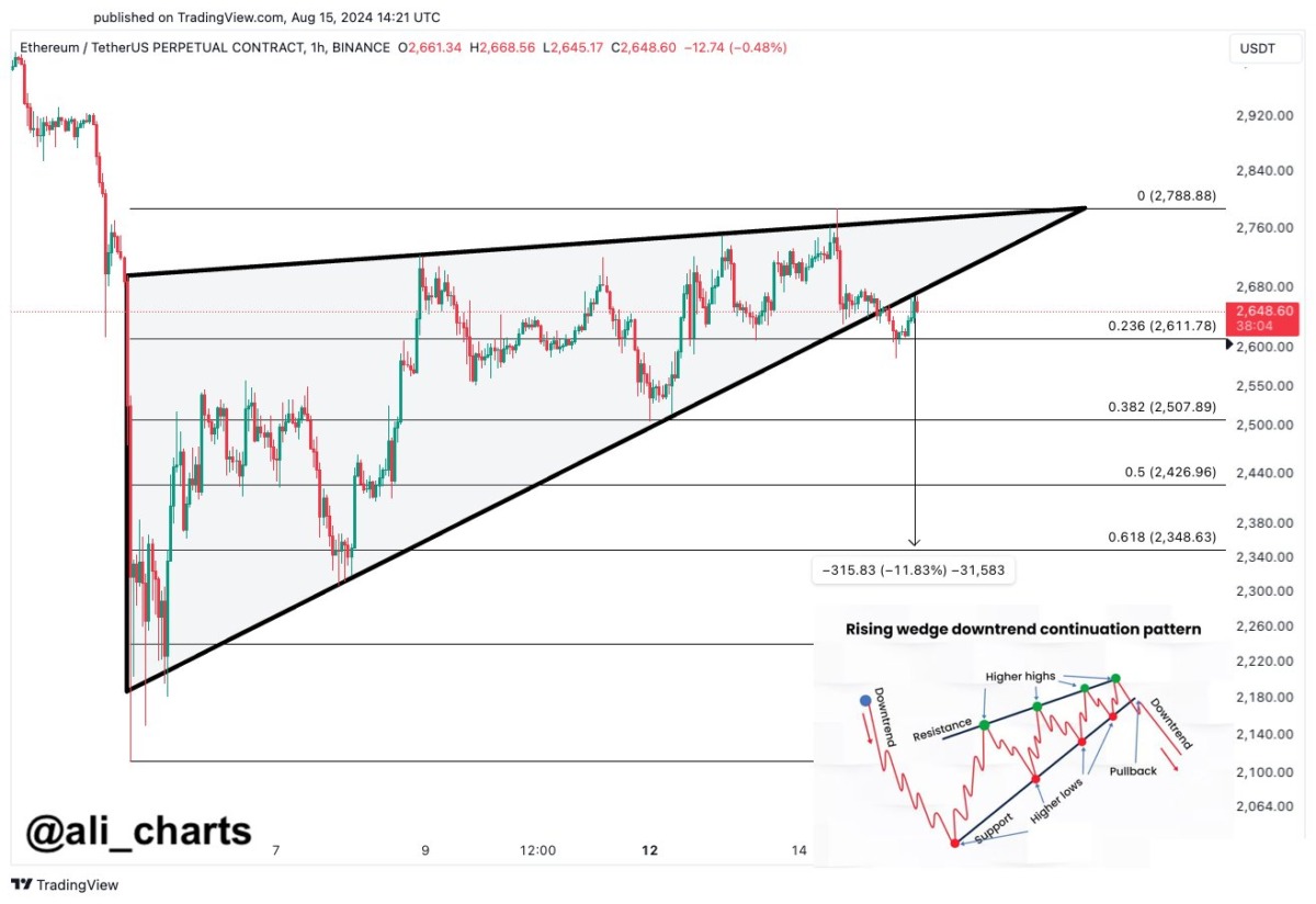 Popüler analist Analist Ali Martinez, ETH’nin yükselen bir kama oluşturuyor olabileceğini, bunun tipik olarak bir sıçramadan sonra daha aşağı yönlü fiyat hareketine işaret eden bir düşüş sinyali olarak yorumlanan teknik bir model olduğunu söylüyor.