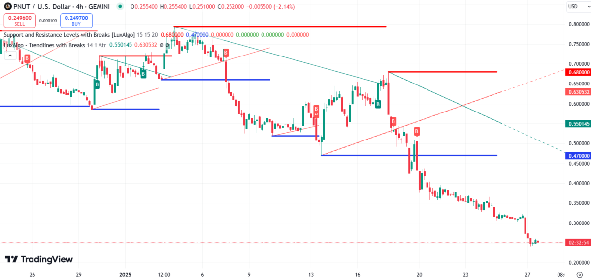 PNUT, 0.550 ve 0.241 dolar destek seviyelerini kaybetti. Şimdi bu seviyeler güçlü direnç haline geldi. Coin şu an 0.252 dolar civarında işlem görüyor ve toparlanmakta zorlanıyor. Günlük grafik, düşüş trendinin sürdüğünü gösteriyor. Tüm üstel hareketli ortalamalar (EMA’lar) fiyatın üzerinde kalıyor. 20 EMA, 0.296 dolar seviyesinde direnç oluşturuyor. Bu seviyenin aşılması şart. Aksi halde düşüş devam edebilir.