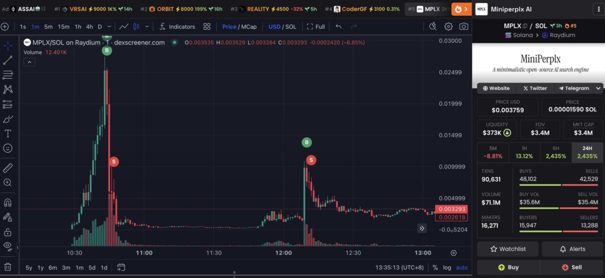 Trader’ın yaşadığı kayıplara rağmen MPLX’in fiyatı ilginç bir şekilde halen dikkat çekici oranlarda işlem görüyor. Miniperplx AI, lansmanındaki sert dalgalanmalarla ünlü oldu. Dexscreener verilerine göre, MPLX’in güncel fiyatı 0.001407 dolar civarında işlem görüyor ve toplam piyasa değeri 1.4 milyon dolara ulaşıyor. Token, 24 saat içinde yüzde 900 oranında değer kazanarak yoğun bir talep gördü. Ancak volatilite nedeniyle fiyatı sürekli dalgalanmaya devam ediyor.
