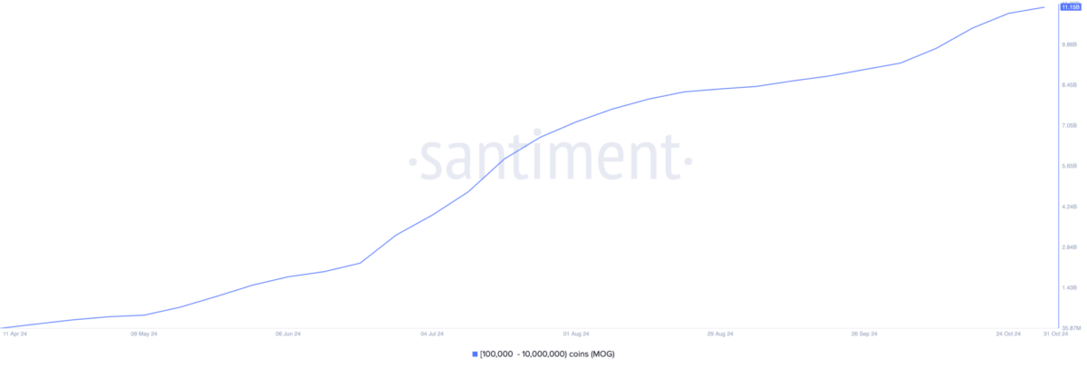 Ellerinde 10.000 ila 100.000.000 arasında token bulunduran MOG balinaları, geçtiğimiz hafta içinde varlıklarını artırdı. Bu balinalar, yalnızca yedi gün içinde 470 milyon MOG tokenı gibi etkileyici bir rakama ulaştı. Bu grup şu anda toplu olarak 11,15 milyar MOG tokenına sahip. Diğer bir ifadeyle bu, meme coin projesinin piyasaya girmesinden bu yana en yüksek seviye.