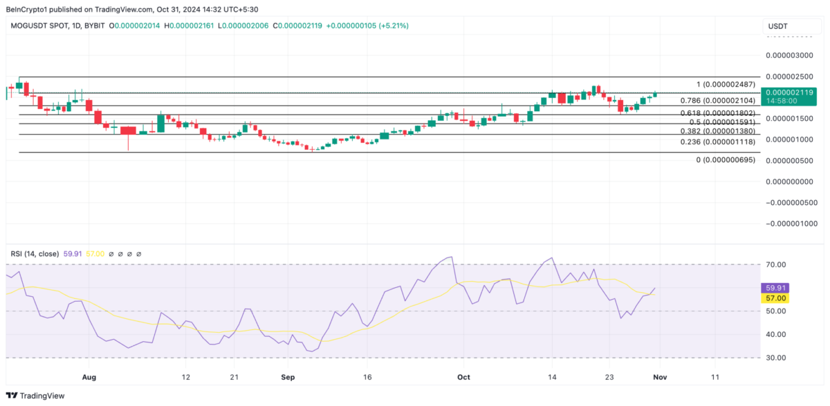 Yazı sırasında MOG coin 0,000002119 dolardan işlem görüyordu. Dolayısıyla, meme coin 0,000002104 dolarlık kilit direnç seviyesinin hemen üzerinde seyrediyor. Bu direnç, mevcut fiyatı ile ATH seviyesi olan 0,000002487 dolar arasında önemli bir engel teşkil ediyor. Meme coin’in yükselen Göreceli Güç Endeksi (RSI), bu direnci bir destek seviyesine çevirmek için güçlü bir potansiyel olduğunu gösteriyor. Şu anda MOG’un RSI değeri 59,91 seviyesinde duruyor. Bu da varlığın aşırı satım ve aşırı alım piyasa koşullarını takip ettiği için önemli bir alım baskısına işaret ediyor.