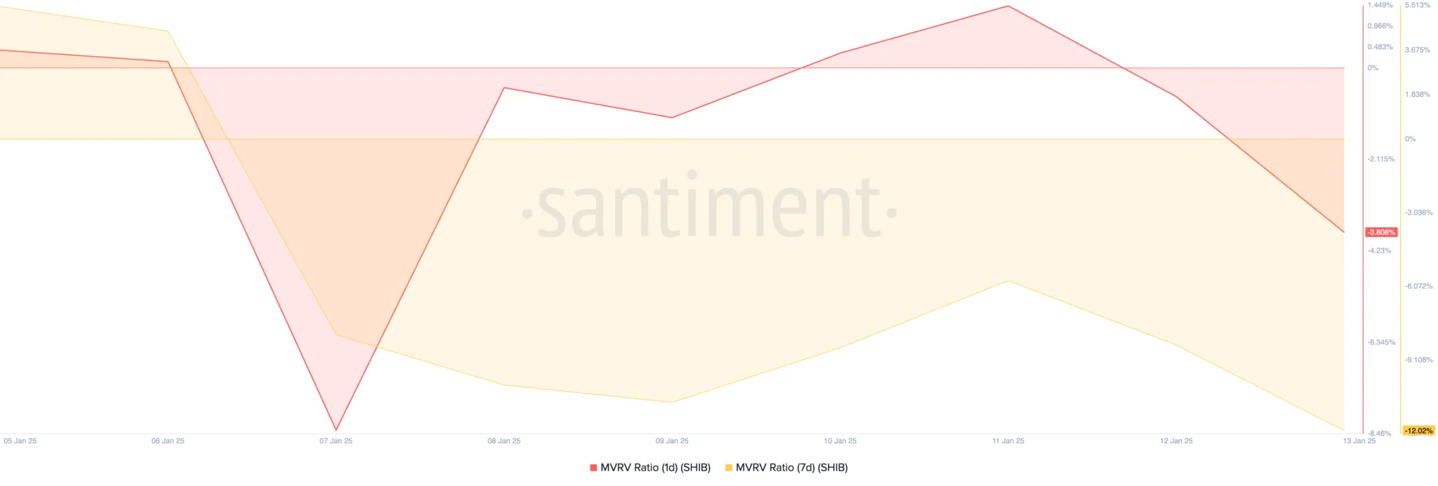 Shiba Inu’nun holderlarının genel kârlılığını değerlendiren piyasa değerinin gerçekleşen değere (MVRV) oranı, tokenin şu anda değerinin altında olduğunu gösteriyor. Bir günlük ve yedi günlük MVRV oranları bu yazı yazıldığı sırada sırasıyla -%3,80 ve -%12,02. MVRV oranı, bir varlığın piyasa değeri ile gerçekleşen değeri arasındaki ilişkiyi ölçerek aşırı değerli mi yoksa düşük değerli mi olduğunu belirler. Pozitif bir MVRV oranı varlığın aşırı değerli olduğunu gösterirken, negatif bir oran piyasanın kripto parayı orijinal satın alma maliyetine kıyasla düşük değerlediğini gösterir.