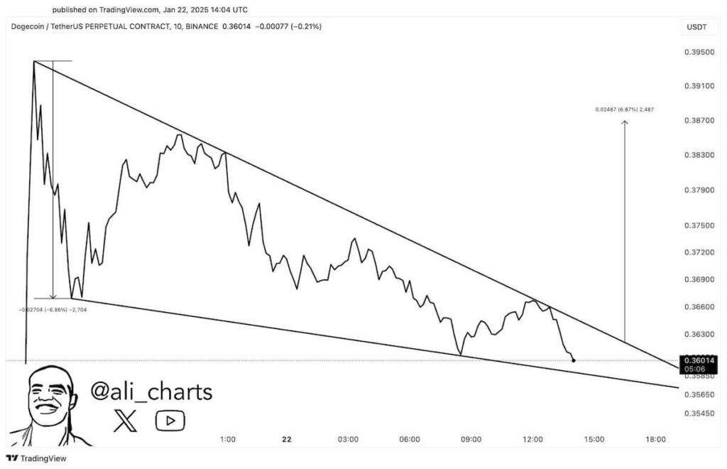Kripto para analisti Ali Martinez, popüler meme coin Dogecoin (DOGE)’nin günlük grafiğinde önemli bir formasyonun oluştuğuna dikkat çekti. “Grafikte net bir düşen takoz formasyonu görüyoruz” diyen Martinez, bunun tipik olarak bir boğa sinyali verdiğini belirtti. Kriptokoin.com olarak da bildirdiğimiz gibi düşen takoz formasyonu, fiyat hareketinin giderek sıkıştığını ve sonunda yukarı yönlü kırılma yapabileceğini gösteren güçlü bir modeldir. Üst trend çizgisi daha düşük zirveleri, alt trend çizgisi ise giderek düşen dipleri bağlar.