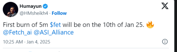 Fetch AI’nın kurucu ortağı Humayun Sheikh, 10 Ocak’ta 5 milyon FET token yakma işlemini duyurdu. Bu girişim, piyasada kıtlık yaratarak değerlerini artırması beklenen toplam FET token arzını azaltmayı amaçlıyor. Token yakma işlemlerini genellikle kripto topluluğu olumlu karşılar. Çünkü bu işlemler genellikle kalan tokenlara yönelik talebin artmasına ve fiyatların yükselmesine neden olur. Bu hamle, token arzını aktif bir şekilde yönetmeyi hedefliyor. Böylece, ekosisteminin uzun vadeli değerini artırmaya yönelik güçlü bir kararlılığa işaret ediyor.