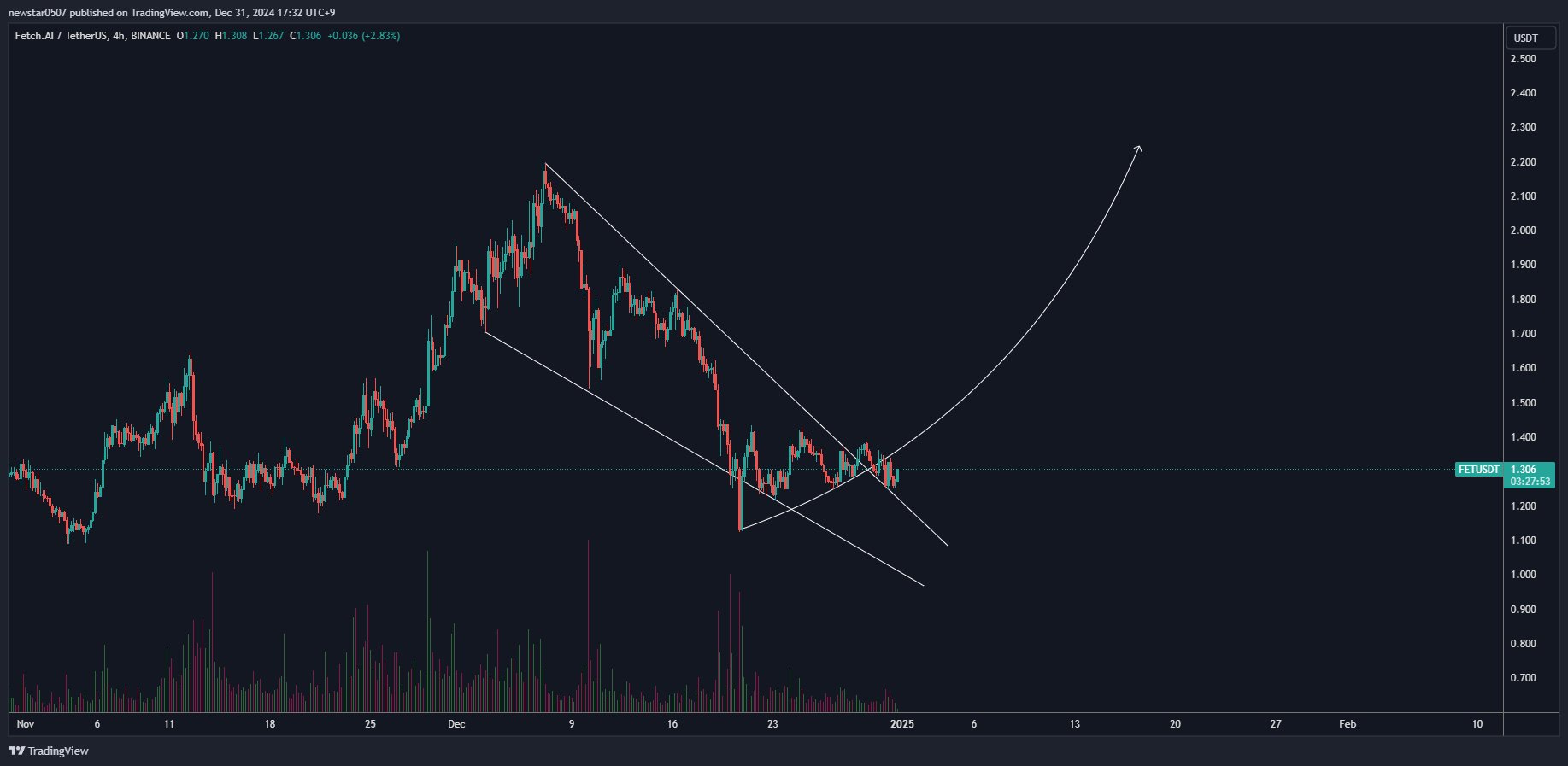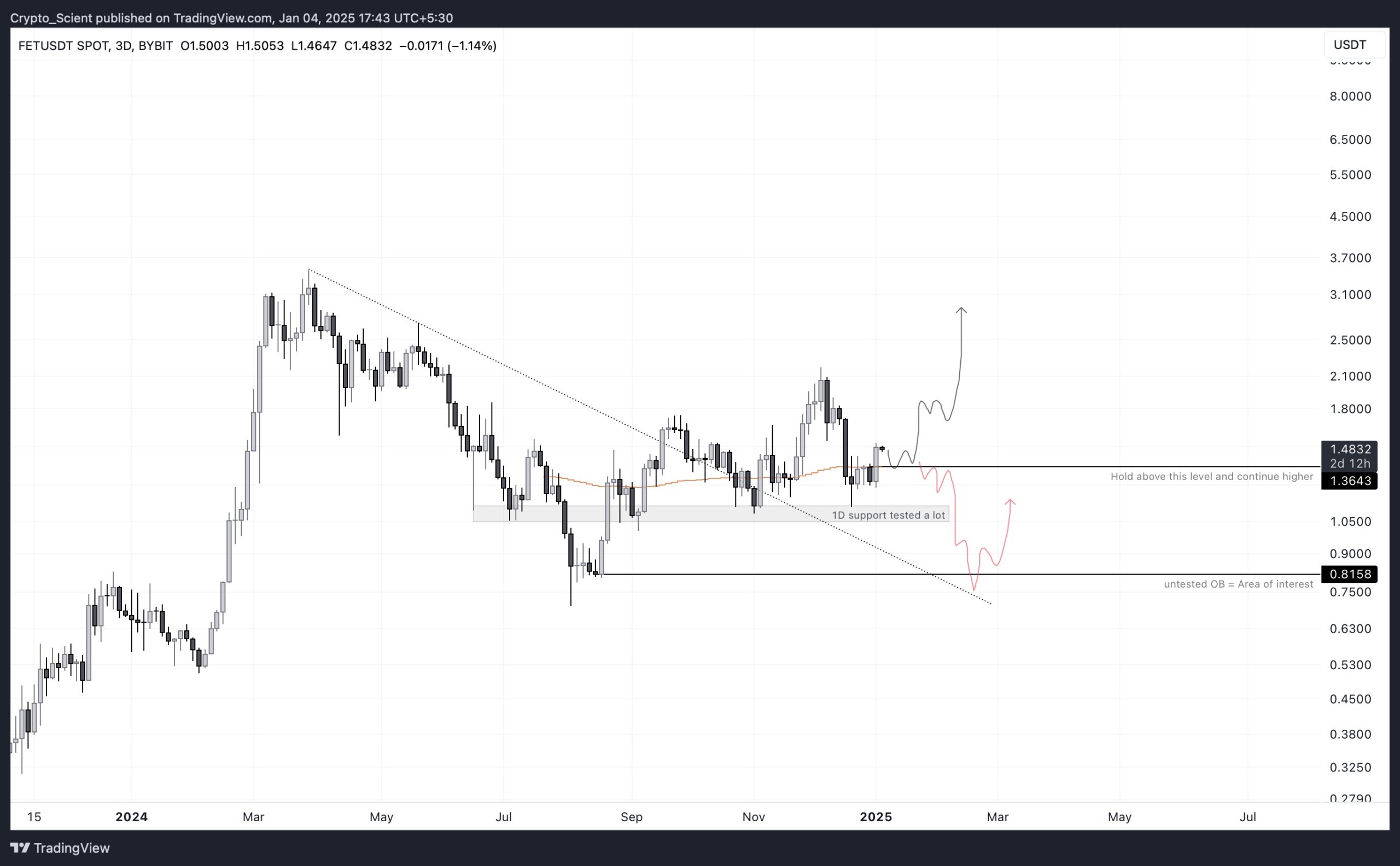 Ayrıca analist Scient, FET için, kriptonun yaklaşık 3 dolara yükseleceğini gösteren bir grafik paylaştı. Bununla birlikte, 1.365 dolar desteğinin altına düşerse, 0.8 dolara kadar bir düşüşe tanık olabileceği konusunda da uyardı.