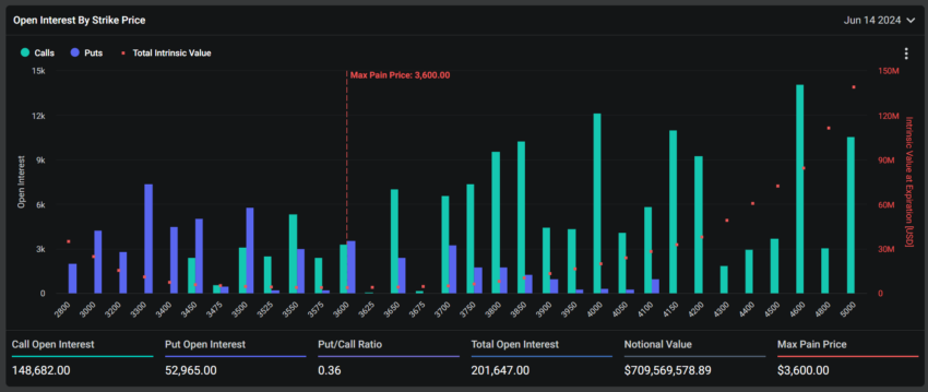 Süresi dolan bu Bitcoin opsiyonlarının maksimum acı noktası 68.500 dolar. Bu, opsiyon sahipleri tarafından en büyük mali kayıpların yaşanacağı fiyat seviyesini temsil ediyor. Ayrıca, piyasa katılımcıları için kritik eşikleri işaret ediyor. Bu arada, 201.647 Ethereum sözleşmesinin süresi de aynı anda dolacak. Deribit’in verilerine göre, bu sözleşmelerin nominal değeri 709,76 milyon dolar ve maksimum acı noktası 3.600 dolar. Veriler ayrıca bu opsiyonlar için put/call oranının 0,36 olduğunu gösteriyor.