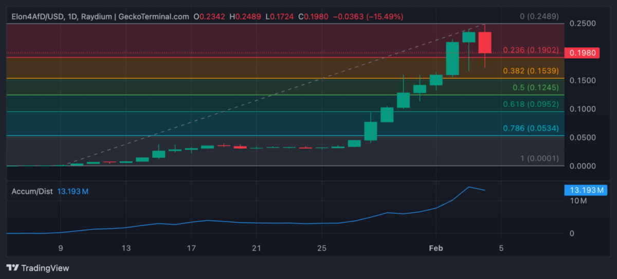 ELON4AFD, günün erken saatlerinde tüm zamanların en yüksek seviyesi olan 0.24 dolara ulaşarak yatırımcıların ilgisini çekti. Ancak bu seviyeden sonra %24’lük bir düzeltme yaşadı.