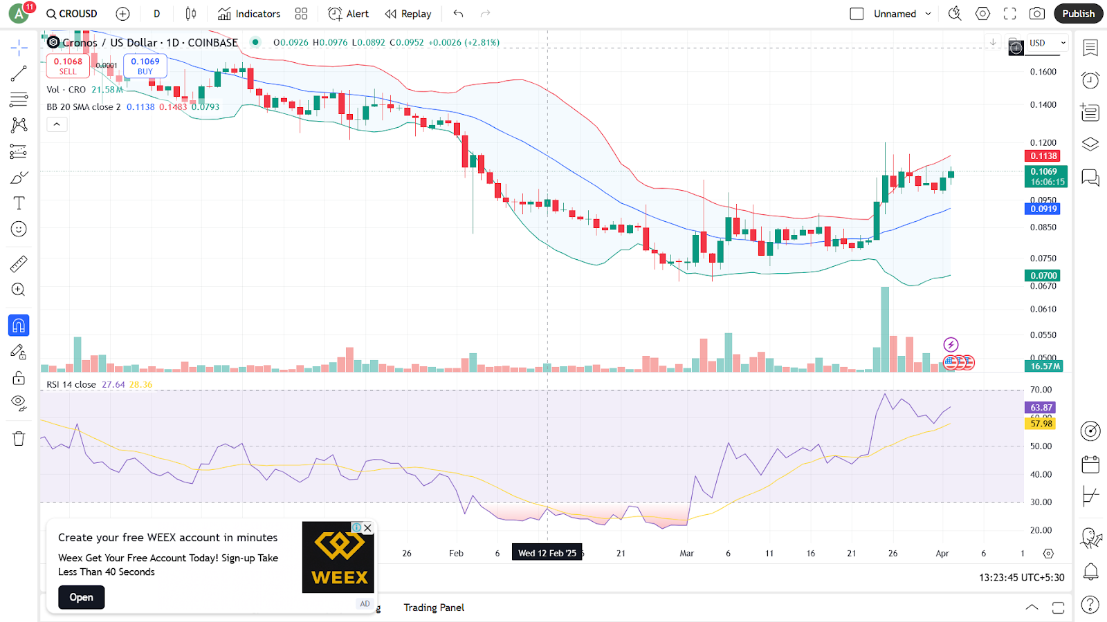 Cronos (CRO), %6,87 oranında artışla 0,1064 dolar seviyesine ulaştı. 24 saatlik işlem hacmi %97,10 artarak 68,61 milyon dolara yükseldi. CRO, 0,1187 dolar seviyesindeki kritik dirence yaklaşıyor. Teknik analiz verilerine göre: