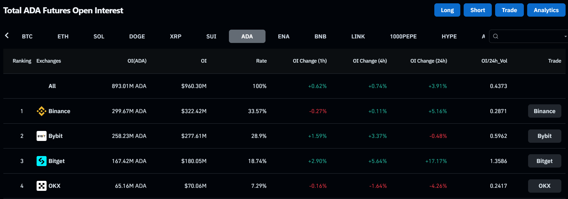 Bu siyasi gelişmelerin yanı sıra, Cardano (ADA) piyasada da önemli bir ivme yakaladı ve 1 dolar sınırını tekrar aştı. Kripto analiz platformu CoinGlass verilerine göre, ADA vadeli işlem piyasasında açık pozisyonlarda (Open Interest – OI) yüzde 9,7’lik bir artış yaşandı. Bu artışla birlikte, yatırımcıların 893,31 milyon ADA (yaklaşık 953,47 milyon dolar) değerinde pozisyon açtığı görülüyor. Bu durum, Cardano topluluğundaki yatırımcı güveninin ve sürekli ilgisinin bir göstergesi olarak yorumlanıyor. Binance, yüzde 33,74 pazar payıyla ADA açık pozisyonlarında lider konumda bulunuyor. Onu Bybit (yüzde 28,25) ve Bitget (yüzde 17,92) takip ediyor.