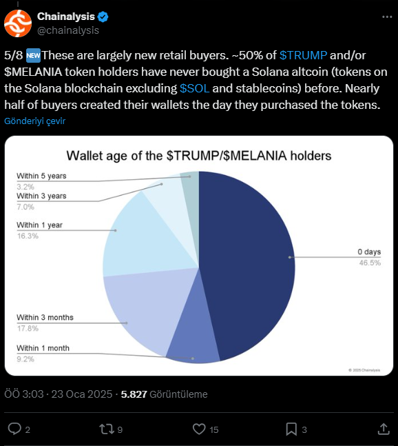 Chainalysis’in raporunda, kullanıcıların neredeyse yarısının cüzdanlarını meme coin alımını gerçekleştirdikleri gün oluşturduğu belirtilmekte. Ayrıca, Trump (TRUMP) ve Melania (MELANIA) meme coinlerine sahip olan kullanıcıların yaklaşık %50’sinin daha önce Solana ağında başka bir token almadığı (SOL ve stablecoin’ler hariç) ortaya çıktı. Bu veriler, meme coin alımlarında Solana ekosistemine tamamen yeni kullanıcıların yoğun ilgi gösterdiğini gözler önüne seriyor.