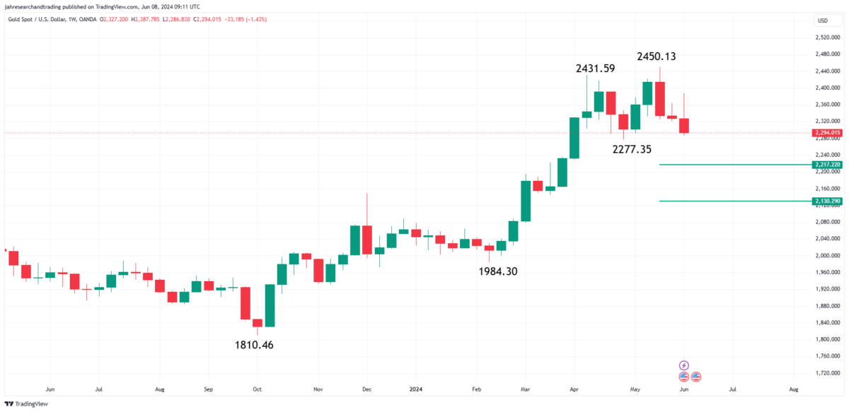 Kriptokoin.com’dan takip ettiğiniz üzere altın geçen haftayı keskin bir düşüşle kapatarak önceki kazançlarını sildi. Düşüşte Çin’in Mayıs ayında külçe altın alımlarını durdurması ve ABD işgücü piyasasının beklenenden daha güçlü olması ve ABD faiz oranlarının beklenenden daha uzun süre yüksek kalabileceğini düşündürmesi etkili oldu. Bu faktörler, Çin’in desteği olmadan altının değeri hakkında soru işaretleri yaratıyor. Haftalık grafik, altının yakın vadeli değerinin 2.217,22 dolar ile 2.130,29 dolar arasını işaret ediyor. Bu da 75 dolar ile 150 dolar arasında potansiyel kayıp anlamına geliyor.