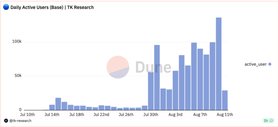 Blockchain takipçisi Dune Analytics, Base ağına katılımın ivme kazandığını ortaya koydu. Dune Analytics verilerine göre blockchain ağında var olan günlük kullanıcı sayısı ilk günden 100.000 sınırını aştı. Coinbase borsasının katman-2 ağına 10 Ağustos 2023 tarihinde 136 bin kullanıcı ulaştı.