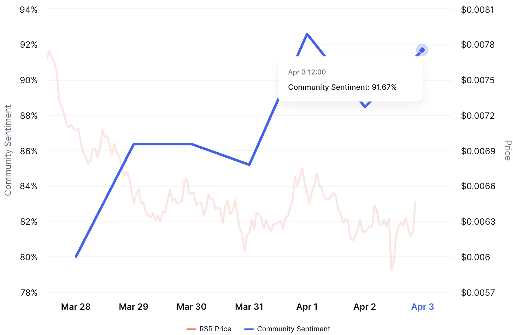 RSR Fiyat Performansı. Kaynak: CoinGeckoSon verilere göre, 0,006 dolardan işlem görüyordu. Bu, son 24 saatte %1,2’lik bir artışı yansıtıyor. Ancak, token güçlü bir topluluk desteği kazandı. CoinMarketCap verileri, kullanıcılar arasında %91,6’lık bir yükseliş eğilimi olduğunu gösterdi. Bu, kullanıcıların potansiyeline olan güveninin arttığının bir işareti.