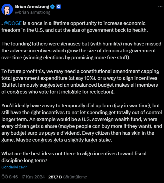 Coinbase CEO Brian Armstrong has announced his support for the newly established Department of Government Efficiency (DOGE), which will be headed by Elon Musk and Vivek Ramaswamy. Created by US President-elect Donald Trump to reduce federal spending and eliminate regulations, this department is seen as an important step for both economic freedom and government restructuring. While the abbreviation DOGE is reminiscent of the famous meme coin Dogecoin, this similarity in name has also made its impact felt on the market. Armstrong, on the other hand, sees this new structure as a great opportunity to shape the future of the country’s economy. Coinbase CEO Brian Armstrong has shown a positive approach to the newly established Department of Government Efficiency (DOGE), which will be headed by Elon Musk and Vivek Ramaswamy.