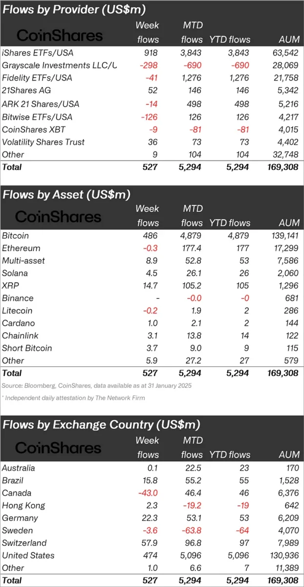 Geçtiğimiz hafta, BlackRock, Bitwise, Fidelity, Grayscale, ProShares ve 21Shares gibi büyük varlık yöneticileri tarafından işletilen küresel kripto fonlarına toplam 527 milyon dolarlık net giriş gerçekleşti. Ancak, bu rakam bir önceki haftaya kıyasla %72’lik bir düşüşe işaret ediyor. Piyasadaki bu dalgalanmalar, eski ABD Başkanı Donald Trump’ın ticaret tarifeleri planları ve DeepSeek kaynaklı piyasa bozulmalarına yönelik endişelerle ilişkilendiriliyor. Bu sırada XRP şu anda en iyi performans gösteren 2. altcoin oldu ve geçen hafta 15 milyon ABD doları girişle yılın başından bu yana toplam 105 milyon ABD doları kadar giriş gördü.