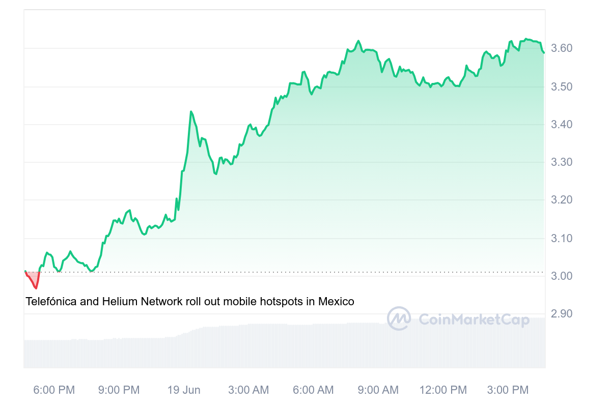 Bu gelişmenin ardından Helium’un yerel tokeni HNT fiyatı yükselmeye başladı. Token gün içinde seyrettiği 2,96 dolar seviyesinde 3,63 dolar seviyesine sıçradı. HNT yazı sırasında bu seviyelere yakın 3,59 dolardan işlem görüyor.