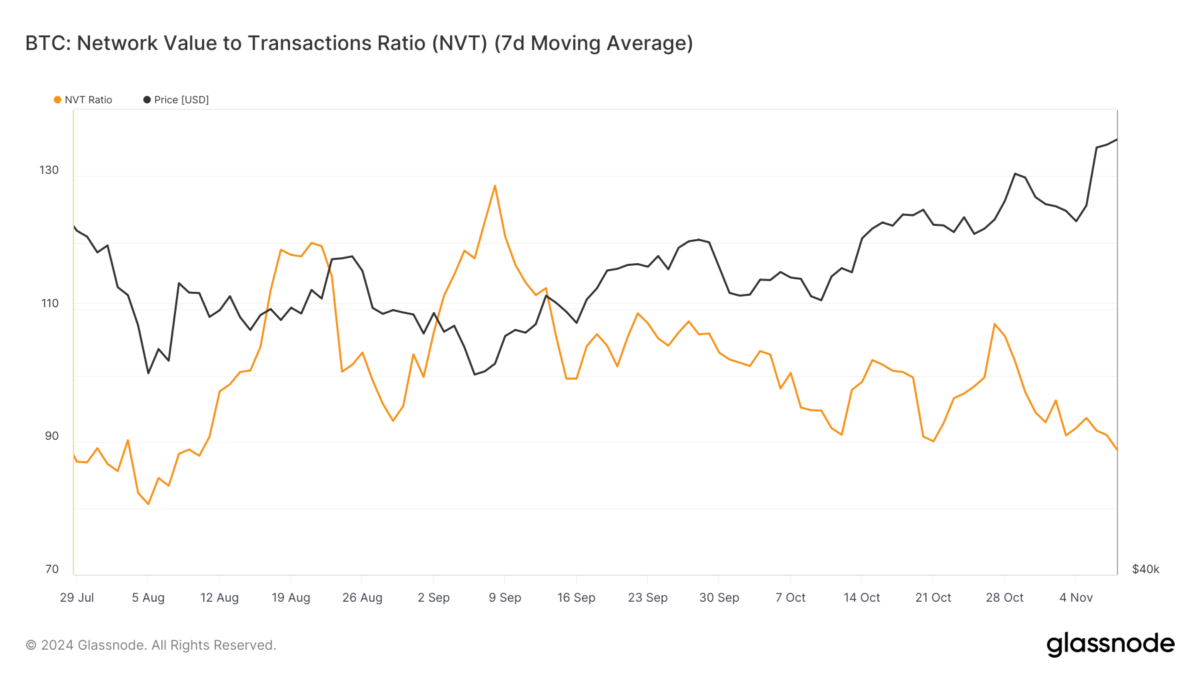 Bitcoin Gerçekleşen Değeri. Kaynak: TradingViewBitcoin için makro momentum da güçlü. Ayrıca, şu anda üç ayın en düşük seviyesinde bulunan NVT (Ağ Değeri – İşlemler) Oranı tarafından destekleniyor. Daha düşük bir NVT Oranı, Bitcoin’in aşırı değerli olmadığını gösterir. Dahası, ani bir düzeltme olasılığını azaltır. NVT’nin gösterdiği bu değer düşüklüğü, Bitcoin’in büyümesinin önceki rallilerde olduğu gibi spekülatif aşırılıktan kaynaklanmadığını gösteriyor. İşlem gücüne dayanan değeriyle Bitcoin, yukarı yönlü yörüngesini korumak için iyi bir konumda. Ayrıca, bunu daha istikrarlı bir büyüme aşaması olarak gören yatırımcıların güvenini ve ilgisini çekiyor.