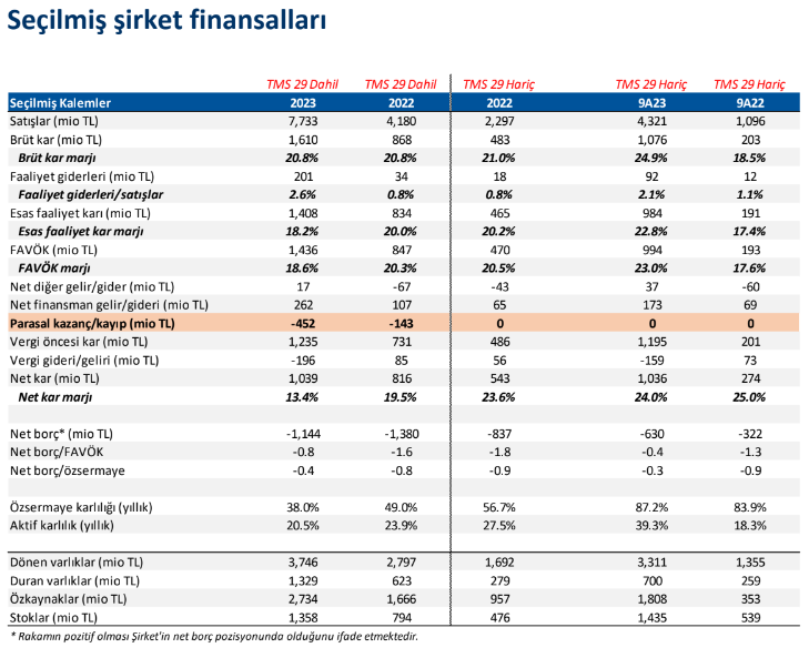 2023 yıl sonu itibariyle Şirket’in 1.144 milyon TL net nakit pozisyonu bulunmaktadır (2022: 1.380 milyon TL net nakit). Net nakit/FAVÖK oranı ise 2023 yıl sonu itibariyle 0,8x seviyesindedir (2022: 1,6x). Şirket’in yatırım dönemin bulunması sonucunda yatırımlara yönelik 599 milyon TL’lik nakit çıkışı oldu.