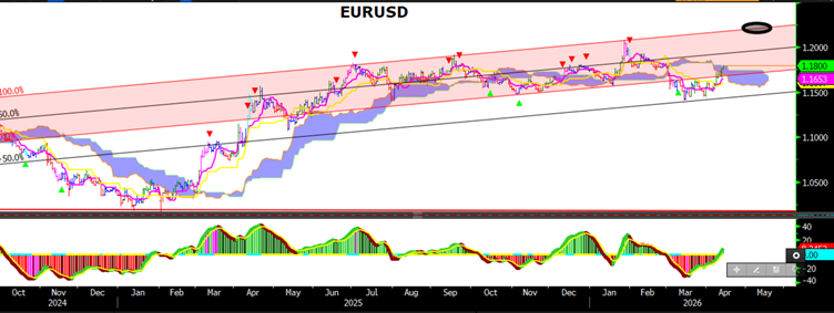 Aşağıdaki grafikte görüleceği üzere parite bir kez daha kırmızı koridora girdi ve bulutun boyalı bölgesinin üzerine atmaya çalışıyor. 1.180 deki bu bölge doğal bir teknik dirençtir. 1.1830 bölgesi ise geçmişte paritenin baskı görüp boyun eğdiği bir başka fiyat bölgesi. Dolayısıyla 1.1800/1830 aralığı kritik bir yer. Eğer kırmayı başarırsa kırmızı koridorun ortasındaki siyah diyagonal direnç bir sonraki mücadele bölgesi olacaktır. Ancak paritenin bu itiş-kakışı yenip 1.22 bölgesine kadar yükselebileceğini değerlendiriyoruz.