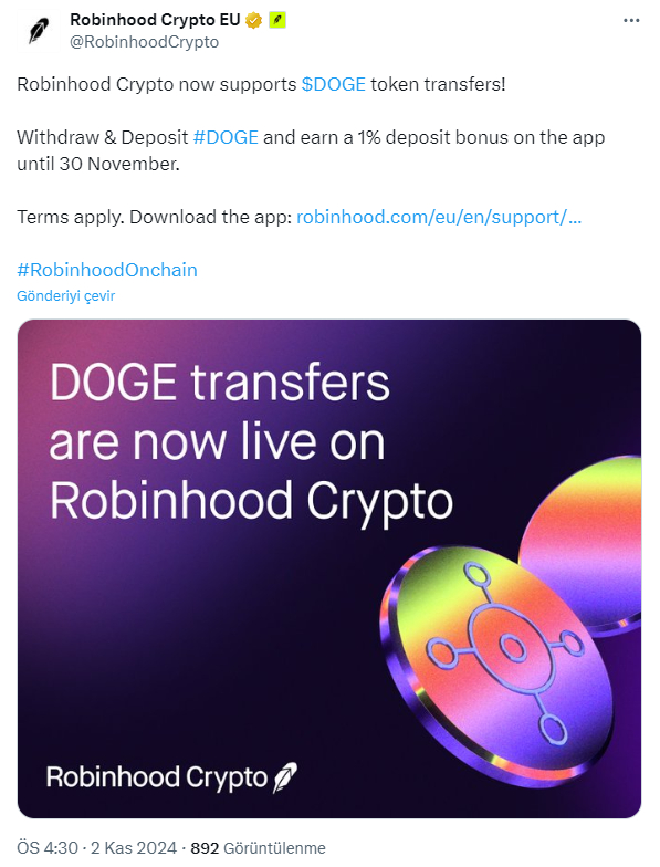 Borsanın kripto kolu olan Robinhood Crypto, bugünden itibaren kullanıcıların Dogecoin (DOGE) yatırıp çekebileceklerini ve 30 Kasım’a kadar %1 para yatırma bonusu kazanabileceklerini duyurdu. Gerçekten de bu lansman, Mayıs ayında tetiklenen son para çekme dalgasından sonra büyük bir hamle. Kriptokoin.com’dan takip ettiğiniz üzere platform, Mayıs’ta ABD SEC’ten bir Wells Bildirimi aldı. Bunun ardından borsa para çekme dalgasıyla karşı karşıya kaldı. SEC’in Robinhood’un kripto bölümüne karşı potansiyel düzenleyici eylem sinyali vermesinin ardından yatırımcılar harekete geçti. O dönemde Dogecoin (DOGE)’den on milyonlarca dolar çekti.