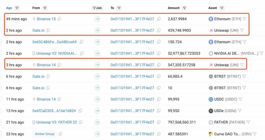 Lookonchain’in bildirdiğine göre, özellikle Amber Group ile ilgili bir adres Binance’ten 9,2 milyon dolar değerinde 2.638 ETH çekti. Bununla birlikte, Uniswap token pozisyonunu iki para çekme işlemiyle gerçekleştirdi. Firma, Binance’den 547.305 UNI ve Gate.io’dan 439.749 UNI olmak üzere toplam 987.054 UNI çekti. Bu alımların toplamı ise 10,6 milyon dolar değerinde.