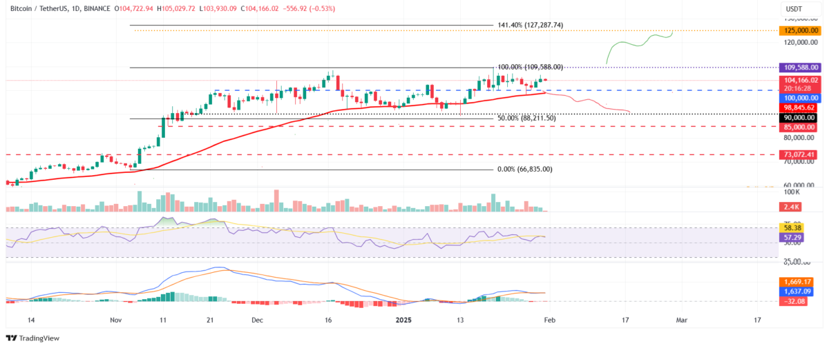 Bitcoin fiyatı Pazartesi günü 98.845 dolar seviyesindeki 50 günlük Üstel Hareketli Ortalama (EMA) civarında destek buldu. Ayrıca, Perşembe günü %2,69 artarak o gün 104.700 doların üzerinde kapandı. Cuma günü yazı sırasında, 104.100 dolar civarında seyrediyor. BTC 100.000 doların altına iner ve günlük bazda 50 günlük EMA’nın altında kapanırsa, düşüşü uzatabilir ve bir sonraki önemli desteğini 90.000 dolar civarında test edebilir.
