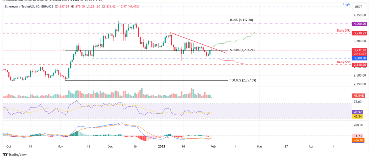Ethereum (ETH) fiyatı Pazartesi günü 3.000 dolarlık psikolojik önem seviyesinden sıçradı ve Perşembe gününe kadar %6,33 yükseldi. Cuma günü yazı sırasında, azalan trend çizgisinin yakınında reddedilme ile karşı karşıya kaldı ve 3.231 dolar civarında işlem görüyor. Azalan trend çizgisi direnç olarak kalırsa, düşüşü 3.000 dolarlık psikolojik önem seviyesini yeniden test edecek şekilde uzatabilir. Bu seviyenin altında başarılı bir kapanış, bir sonraki günlük desteğini 2.810’da test etmek için ek bir düşüşü uzatacaktır.