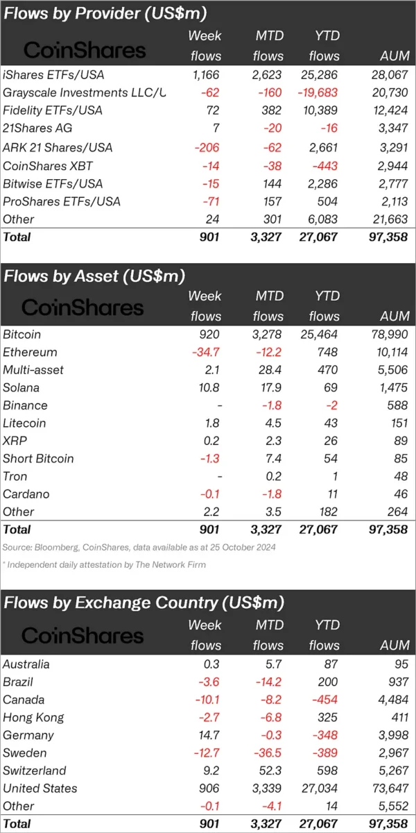 Kripto varlık piyasasında bu ay yaşanan yoğun hareketlilik, ABD siyasi gündemindeki gelişmelerle birleşerek yatırımcıların ilgisini çekmeye devam ediyor. CoinShares’in son raporuna göre, kripto varlıklara yönelik yatırım fonlarına yalnızca bu ay toplamda 901 milyon dolar giriş gerçekleşti. Yılın başından itibaren toplam 27 milyar dolar olan fon girişleri, 2021’de kırılan rekorun üç katına yaklaşmış durumda. En yüksek fon girişi ise ABD’den geldi. Almanya ve İsviçre gibi Avrupa ülkelerinde de hafif kazançlar kaydedilmekte. Özellikle Kanada, Brezilya ve Hong Kong’da ise ufak çaplı çıkışlar yaşandı. Bu sırada Ethereum (ETH), short Bitcoin ve Cardano’dan fon çıkışları oldu. İşte detaylar…