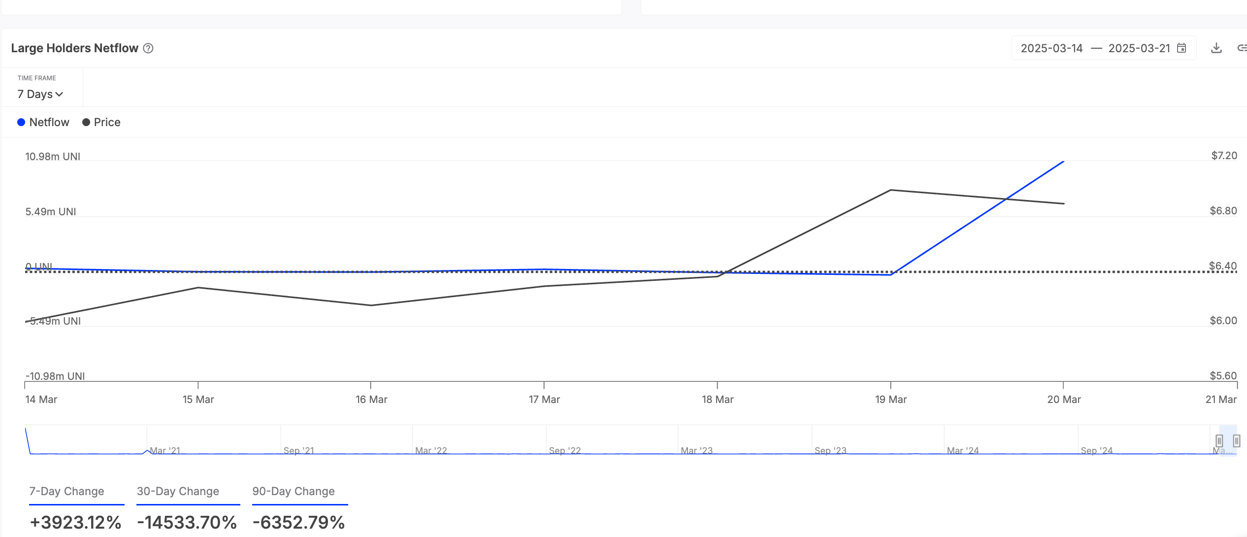 Merkeziyetsiz finans (DeFi) projelerinin önde gelen tokenlerinden UNI, bu hafta büyük yatırımcıların radarına girdi. IntoTheBlock verilerine göre, UNI’nin büyük yatırımcı net akışı son yedi gün içinde %3900 gibi devasa bir artış gösterdi.