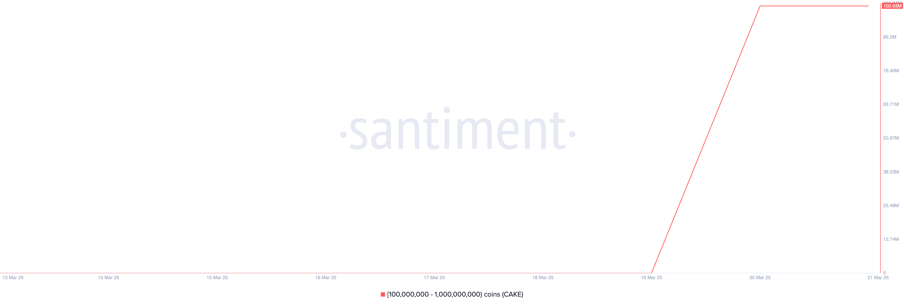 Santiment verilerine göre, uzun süredir hareketsiz olan ve 100 milyon ile 1 milyar CAKE arasında varlığa sahip balinalar, yeniden aktif hale geldi. Sadece son 24 saatte bu büyük yatırımcılar, toplam değeri 250 milyon doları aşan 101 milyon CAKE satın aldı. Eğer bu birikim eğilimi devam ederse, CAKE geniş çaplı piyasa düşüş trendine direnerek kazanç sağlayabilir.