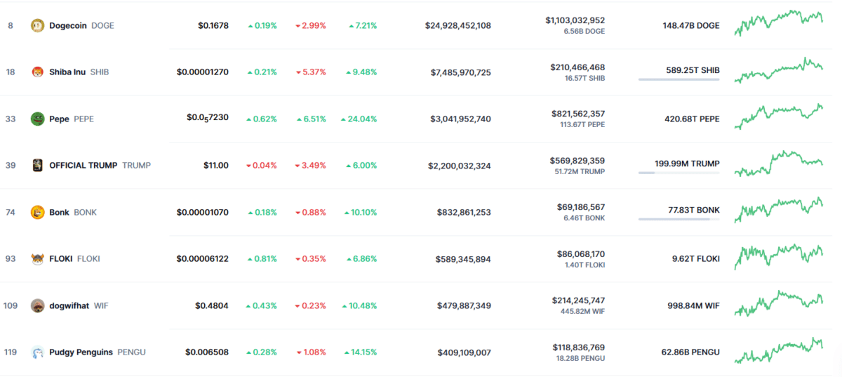 Özellikle Dogecoin %7,21 değer kazanırken, Shiba Inu (SHIB) %9,48 artışla dikkat çekti. Küçük piyasa değerine sahip Pepe (PEPE) ise %24,04’lük yükselişle lider konumda. Bu trend, yatırımcıların memecoin’lere olan ilgisinin devam ettiğini gösteriyor.