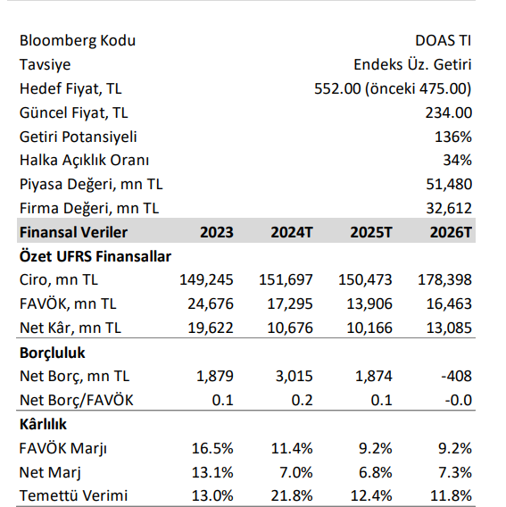 2Ç24’te yönetim pazar ve toptan satış beklentilerini artırdı. Fakat yönetim pazar payı beklentisini düşürdü. 4Ç23’te başlayan fiyatlama gücündeki zayıflama ve marjlardaki daralmanın 1Y24’te devam ettiğini izliyoruz. Şirket 2Ç24 sonuçlarıyla birlikte sürpriz bir temettü açıkladı. Şirket brüt 10 TL/hisse temettü dağıtma kararı aldı. Hak kullanım tarihi 2 Eylül 2024 olarak belirlendi. Modelimizi enflasyon muhasebesine göre güncelledik. Doğuş Otomotiv için hedef fiyatımızı 475 TL’den 552 TL’ye yükselttik. Şirket için “Endeksin Üzerinde Getiri” tavsiyemizi koruyoruz. Piyasanın sonuçlara tepkisinin “Olumsuz” olacağını düşünüyoruz.