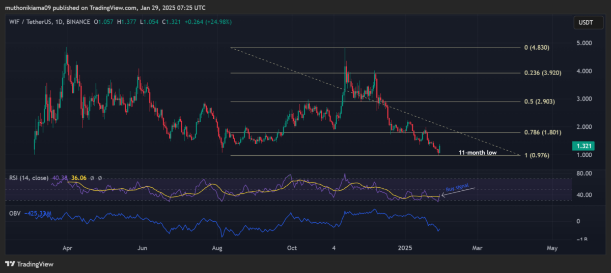 Meme coin piyasası 29 Ocak’ta düşüş eğilimindeydi ve bu segmentteki toplam piyasa değeri %2 azalarak 92 milyar dolara geriledi. Ancak Solana (SOL) ekosistemine ait popüler meme coin’lerden biri olan dogwifhat (WIF), genel düşüş trendine meydan okuyarak %12’lik bir yükseliş yakaladı. Yazım sırasında WIF, 1.32 dolardan işlem görüyordu.