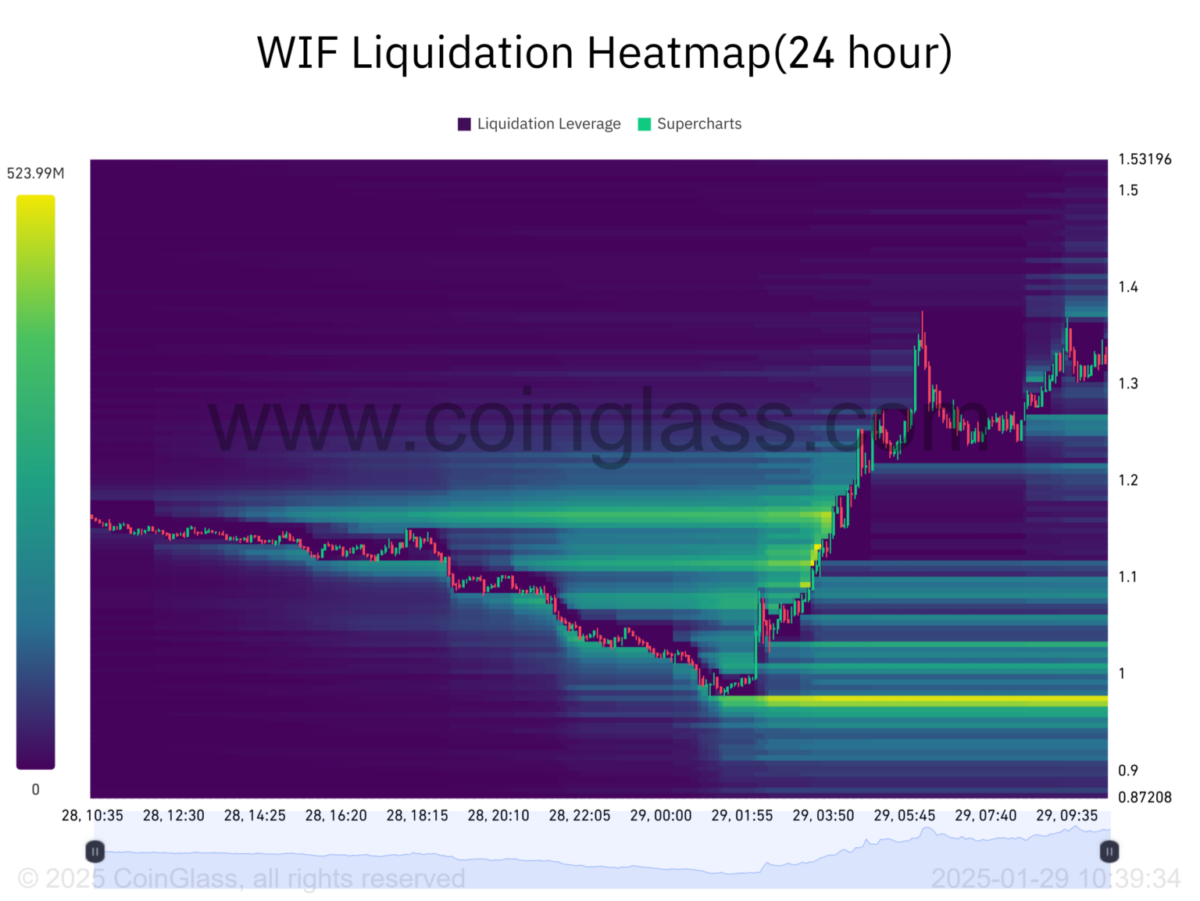 Son 24 saat içinde 2 milyon dolarlık short pozisyonun zorunlu olarak kapatılmasıyla, piyasada güçlü bir alım baskısı oluştu. Coinglass’ın likidasyon haritası incelendiğinde, bu likiditasyonlar sırasında WIF’in fiyatının yukarı yönlü hareket ettiği görülüyor. Önümüzdeki en büyük likidasyon kümesi 1.37 dolar seviyesinde bulunuyor. Eğer WIF bu seviyeye ulaşırsa, short pozisyondaki yatırımcılar zorunlu olarak alım yapmak zorunda kalabilir, bu da yükselişi destekleyebilir.